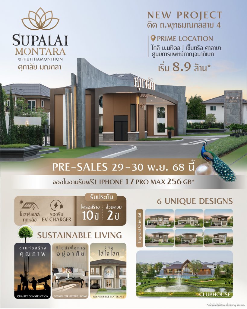 ผสานชีวิตเมืองบริบทใหม่ ใจกลางความเงียบสงบแห่งเดียวติดพุทธมณฑล สาย 4 นำแบบบ้านซีรีส์ล่าสุด “Tropical Oriental” เปิดตัวครั้งแรกในโครงการ “ศุภาลัย มณฑลา @พุทธมณฑล” บนพื้นที่โครงการกว่า 61 ไร่ มูลค่าโครงการ 2,380 ล้านบาท บ้านเดี่ยวหลังใหญ่ บนพื้นที่กว้างขวางและเป็นส่วนตัว ในสังคมคุณภาพเพียง 236 ครอบครัว ราคาเริ่มต้น 8.9 ล้านบาท พร้อมแบบบ้านให้เลือกมากถึง 6 แบบ ด้วยพื้นที่ใช้สอย 190-393 ตารางเมตร 4-5 ห้องนอน 3-7 ห้องน้ำ 2 พื้นที่พักผ่อน 2-3 ที่จอดรถ พร้อมฟังก์ชันที่ตอบโจทย์ทุกไลฟ์สไตล์ของครอบครัว รองรับแนวคิด Green & Smart Living ด้วยระบบ Home Automation & Security พร้อมติดตั้งโซลาร์เซลล์ทุกหลัง และรองรับ EV Charger เติมเต็มช่วงเวลาแห่งการพักผ่อนท่ามกลางธรรมชาติ กับสวนส่วนกลางขนาดกว่า 2 ไร่ ที่รองรับกิจกรรมหลากหลายรูปแบบ ทั้ง Pavilion จุดพักผ่อนกลางสวน Putting Green และสนามเด็กเล่น พร้อมอาคารสโมสรขนาดใหญ่ที่ออกแบบให้เชื่อมต่อกับธรรมชาติภายนอก มาพร้อมฟิตเนสและสระว่ายน้ำระบบน้ำแร่ อุ่นใจด้วยระบบรักษาความปลอดภัยตลอด 24 ชั่วโมง กล้อง CCTV ครอบคลุมทั่วพื้นที่ และระบบเข้า-ออกอัตโนมัติแบบอ่านป้ายทะเบียน เพื่อความสะดวกและปลอดภัยของทุกครอบครัว พร้อมรับประกันโครงสร้างนาน 10 ปี และส่วนควบ 2 ปี Pre-Sales วันที่ 29-30 พฤศจิกายน 2568