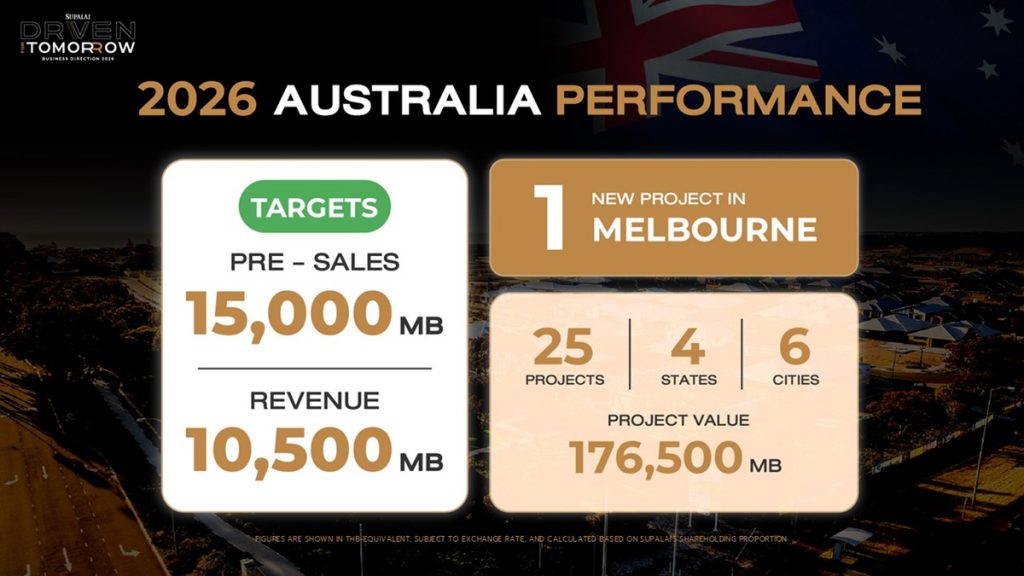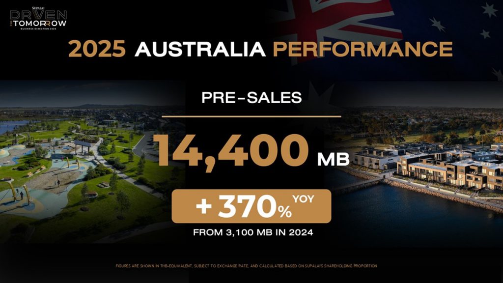 โดยในปี 2568 ที่ผ่านมา บริษัทฯ มีโครงการปิดการขายแล้ว (Sold out) ภายในปี รวม 21 โครงการ มูลค่าโครงการ 35,470 ล้านบาท แบ่งเป็นโครงการแนวราบ 13 โครงการ และโครงการคอนโดมิเนียม 8 โครงการ และในปี 2569 นี้ บริษัทฯ ยังเตรียมเปิดตัวโครงการสำคัญ อาทิ “ศุภาลัย ลอฟท์ ท่าพระ อินเตอร์เชนจ์” และ “ศุภาลัย พรีมา วิลล่า รังสิต คลอง 3” พร้อมขยายการพัฒนาไปยังจังหวัดสุพรรณบุรีและเกาะ สมุย จังหวัดสุราษฎร์ธานี ครอบคลุม 30 จังหวัดทั่วประเทศ ขณะเดียวกันบริษัทฯ ต่อยอดกรอบคิดเดียวกันสู่พาร์ท Global Driven โดยชูออสเตรเลียเป็นตลาดต่างประเทศที่เห็นศักยภาพชัดเจนจากตัวเลขผลงาน ปี 2568 ที่เติบโตกว่า 370% และปี 2569 บริษัทฯ ตั้งเป้ายอดขายที่ 15,000 ล้านบาท* โดยเน้นบริหารพอร์ตให้ “สมดุล” และเลือกโครงการที่ตอบโจทย์ดีมานด์จริง เพื่อให้รายได้ต่างประเทศเป็นฐานที่มีคุณภาพและช่วยเสริมเสถียรภาพบริษัทฯ ในระยะยาว