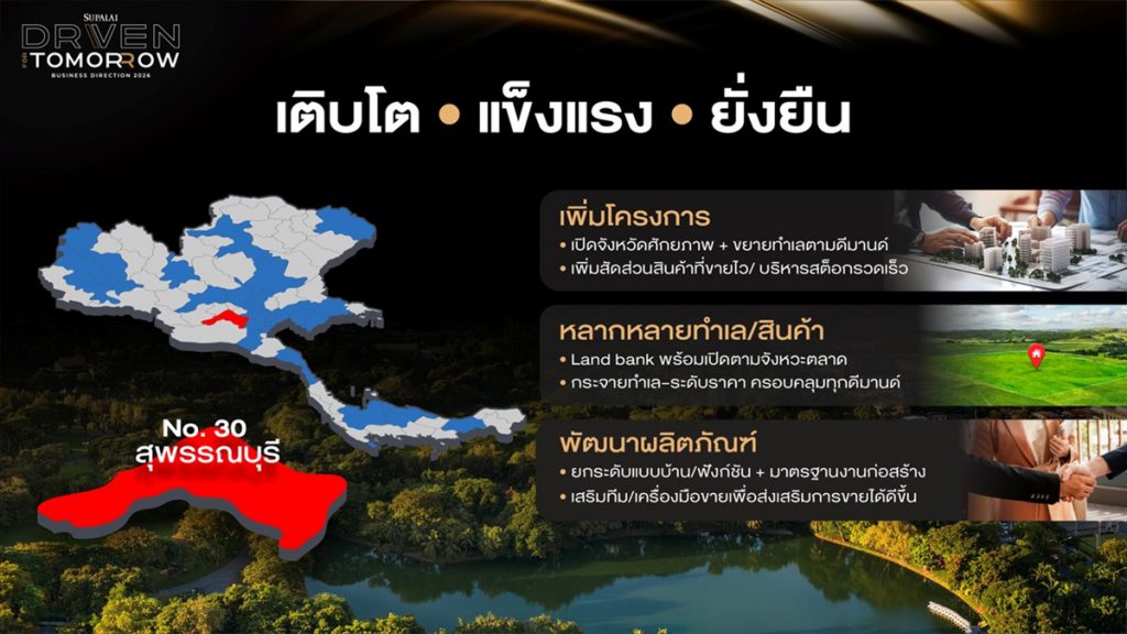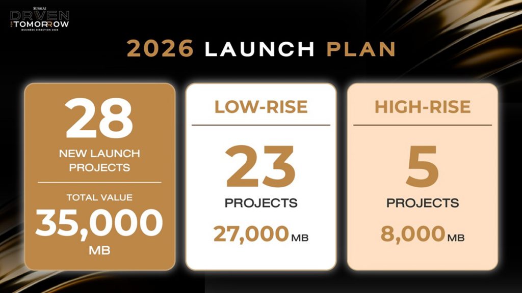 นายไตรเตชะ ตั้งมติธรรม กรรมการผู้จัดการ บริษัท ศุภาลัย จำกัด (มหาชน) กล่าวว่า ปี 2568 เป็นปีแห่งความท้าทายจากปัจจัยที่กระทบต่อความเชื่อมั่นและการดำเนินงาน แต่บริษัทฯ ได้พิสูจน์ความแข็งแกร่งในศักยภาพขององค์กรและกระบวนการทำงาน รวมไปถึงความสามารถในการบริหารสถานการณ์ ทำให้ปี 2569 จะเป็น Year of Strength ที่ศุภาลัยจะเดินหน้าอย่างมั่นคงบนฐานที่พร้อมกว่าเดิม สำหรับปี 2569 ศุภาลัยกำหนดเป้าหมายการดำเนินงานผ่าน 3 ตัวชี้วัดหลัก ได้แก่ เป้าหมายยอดขายในประเทศไทย 30,000 ล้านบาท มูลค่าโครงการเปิดใหม่ 35,000 ล้านบาท และงบซื้อที่ดิน 8,000 ล้านบาท เพื่อสร้างความต่อเนื่องของพอร์ตโครงการ พร้อมวางแผนเปิดโครงการใหม่รวม 28 โครงการ ครอบคลุมทั้งกรุงเทพฯ–ปริมณฑลและภูมิภาค โดยบริหารพอร์ตให้สมดุลระหว่างโครงการแนวราบและคอนโดมิเนียม ด้านรายได้ในปีนี้ บริษัทฯ ตั้งเป้าหมายรับรู้รายได้ประมาณ 27,000 ล้านบาท โดยมีโครงการคอนโดมิเนียมพร้อมโอนกรรมสิทธิ์เป็นแรงขับเคลื่อนหลัก ได้แก่ ศุภาลัย ปาร์ค เอกมัย–พัฒนาการ, ศุภาลัย เซนส์ ศรีนครินทร์ และ ศุภาลัย คราม เขาเต่า รวมมูลค่า 6,080 ล้านบาท