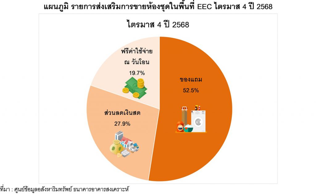 เรื่อง “ดัชนีราคาห้องชุด ในพื้นที่ EEC ไตรมาส 4 ปี 2568” มีค่าดัชนีเท่ากับ 102.2 จุด เพิ่มขึ้นเล็กน้อยร้อยละ 0.1 เมื่อเทียบกับ ช่วงเดียวกันของปีก่อน (YoY) ซึ่งมีค่าดัชนีอยู่ที่ 102.1 จุด อย่างไรก็ตาม เมื่อเทียบกับไตรมาสก่อน (QoQ) ดัชนีดังกล่าว ปรับตัวลดลงร้อยละ -1.1 การปรับลดลงมีสาเหตุหลักมาจากอุปทานห้องชุดเหลือขายที่ยังอยู่ ในระดับสูง และในบางทำเลมีการเปิดตัวโครงการใหม่อย่างต่อเนื่อง ส่งผลให้ผู้ประกอบการจัดโปรโมชัน เร่งระบายสต็อกที่อยู่อาศัย เช่น การให้ของแถมและส่วนลดเงินสด เพื่อกระตุ้นการตัดสินใจของผู้บริโภคที่มีกำลังซื้อลดลง จากภาวะเศรษฐกิจที่ขยายตัวในอัตราที่ลดลง