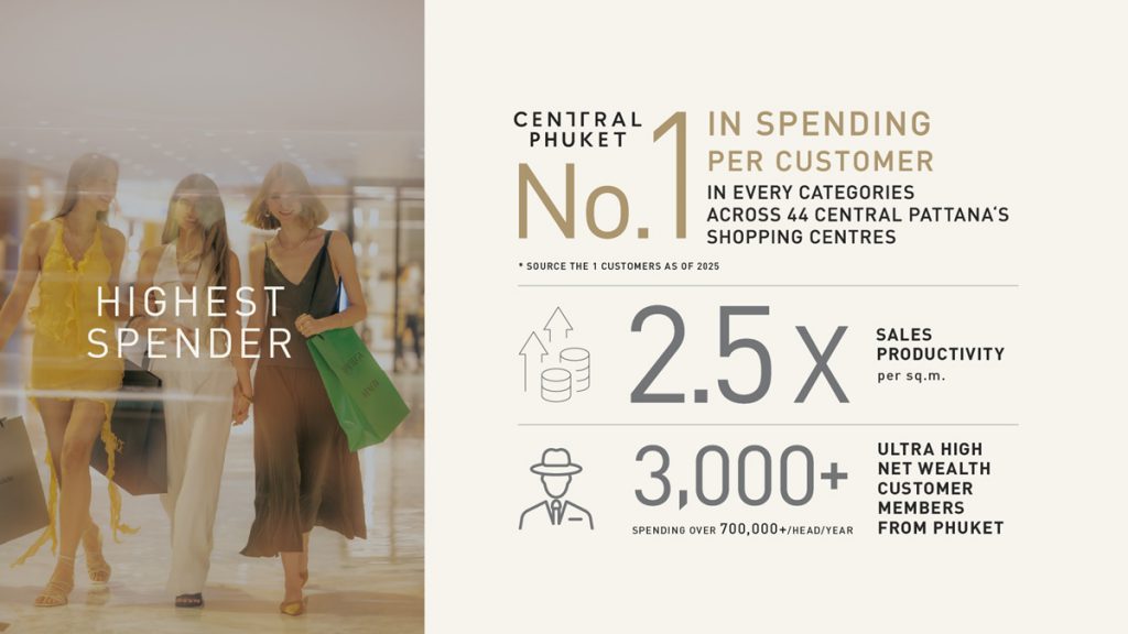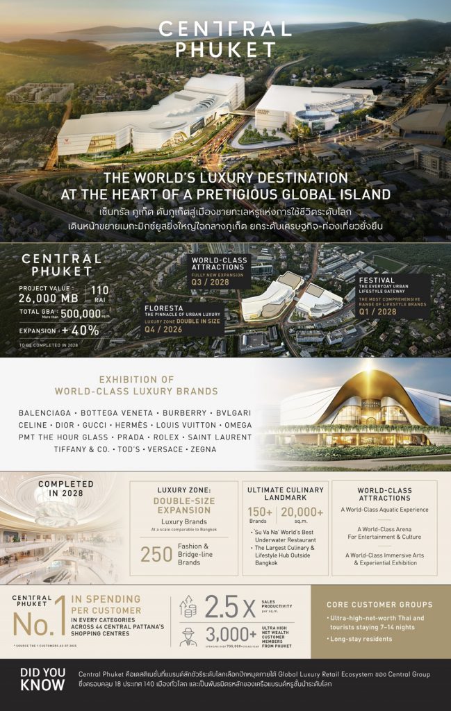 กลุ่มเซ็นทรัล บริหาร Luxury retail ในกว่า 18 ประเทศ 140 เมืองทั่วโลก และเป็นหนึ่งใน Global Strategic Partner ของเครือแบรนด์หรูระดับโลก มียอดขายมูลค่ามหาศาลต่อปี ย้ำความเชื่อมั่นให้แบรนด์ระดับโลกยังคงเลือกเติบโตกับเราอย่างต่อเนื่อง โดยจากศักยภาพของภูเก็ตและความเชื่อมั่นที่แบรนด์มีต่อเซ็นทรัล ภูเก็ต ซึ่งพิสูจน์ได้จากยอดขายที่เติบโตต่อเนื่อง และหลายแบรนด์มียอดขายเป็นอันดับ 1 ของประเทศที่นี่ ทำให้แบรนด์ระดับโลกตัดสินใจขยายพื้นที่ร้าน พร้อมพัฒนาคอนเซ็ปต์ใหม่ในระดับแฟล็กชิป รวมถึง Phuket Exclusive items ที่มีเฉพาะที่เซ็นทรัล ภูเก็ต เท่านั้น ด้วยศักยภาพต่างๆ นี้ เราจึงเดินหน้าขยาย Luxury zone เพิ่มอีกเท่าตัว และเพิ่มจำนวนแบรนด์ลักชูรี่ต่อเนื่อง โดยภายในปี 2028 จะขยายสเกลเทียบเท่ากรุงเทพฯ ทำให้เซ็นทรัล ภูเก็ต เป็นศูนย์การค้าหนึ่งเดียวนอกกรุงเทพฯ ที่รวมแบรนด์ลักชูรี่ระดับต้นๆ ของโลกไว้เกือบครบที่สุด  เซ็นทรัล ภูเก็ต พร้อมเป็น Global ecosystem ที่แบรนด์ลักชูรีทั่วโลกเลือกปักหมุด ผลักดันให้ภูเก็ตอยู่บนแผนที่โลกในฐานะเมืองลักชูรีระดับโลก โดยมีเซ็นทรัล ภูเก็ต เป็นหนึ่งในแรงขับเคลื่อนสำคัญของภาพนั้น”