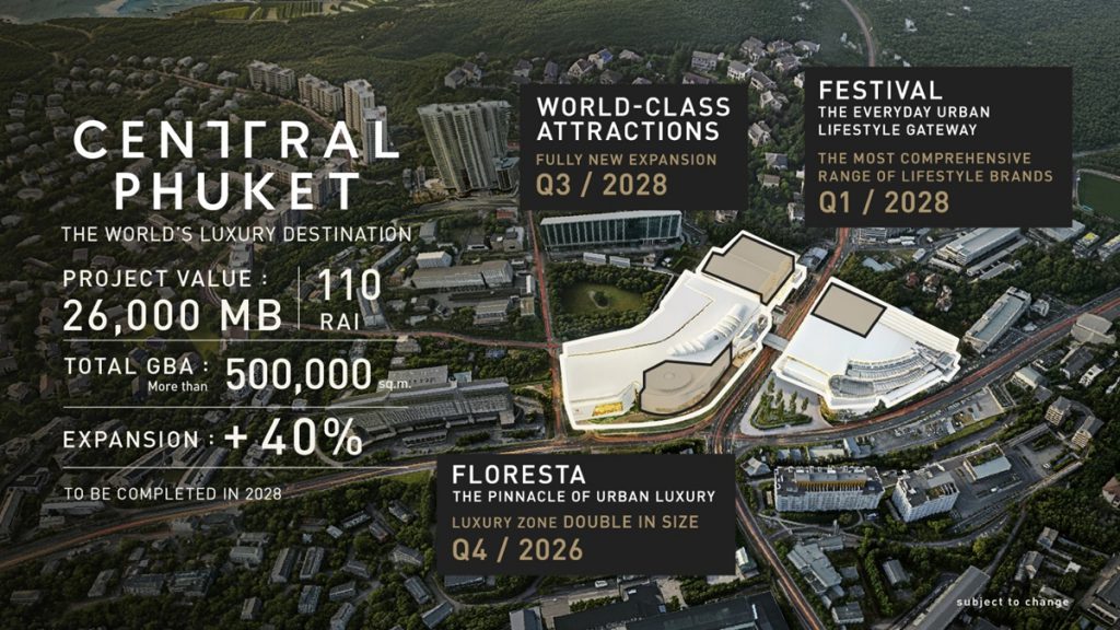 ชาตรี โกวิทานุพงศ์ Head of Project Development บมจ.เซ็นทรัลพัฒนา กล่าวเสริมว่า “Retail-Led Mixed-Use ที่มีรีเทลเป็นหัวใจของ Ecosystem เป็น Daily touchpoint ที่เชื่อมผู้คนเข้ากับทุกฟังก์ชั่นของพื้นที่ โดยเซ็นทรัล ภูเก็ต คือศูนย์กลางการใช้ชีวิตของคนทั้งเกาะที่เชื่อมโยงการใช้ชีวิต เศรษฐกิจ และการเติบโตของเมือง โดยการขยายโครงการเมกะมิกซ์ยูสนี้ คาดว่าจะเสร็จสมบูรณ์ในปี 2028 ทั้ง 3 ส่วน ประกอบด้วย เซ็นทรัล ภูเก็ต ฟลอเรสต้า “The Pinnacle of Urban Luxury” ขยายพื้นที่ลักชูรีเพิ่มอีกเท่าตัว เป็น     The World’s Luxury Destination ที่สมบูรณ์แบบที่สุดนอกกรุงเทพฯ คาดเปิดไตรมาส 4 ปี 2026 เซ็นทรัล ภูเก็ต เฟสติวัล “The Everyday Urban Lifestyle Gateway” ยกระดับประสบการณ์ช้อปปิ้ง ผสาน    รีเทล แฟชั่น ไลฟ์สไตล์ และพื้นที่กิจกรรมไว้ด้วยกัน คาดเปิดไตรมาส 1 ปี 2028 World-Class Attractions แลนด์มาร์กใหม่ที่รวม Aquatic Experience, World-class Arena for Entertainment & Culture และ Immersive Park บนพื้นที่ต่อขยาย 14 ไร่ คาดเปิดไตรมาส 3 ปี 2028