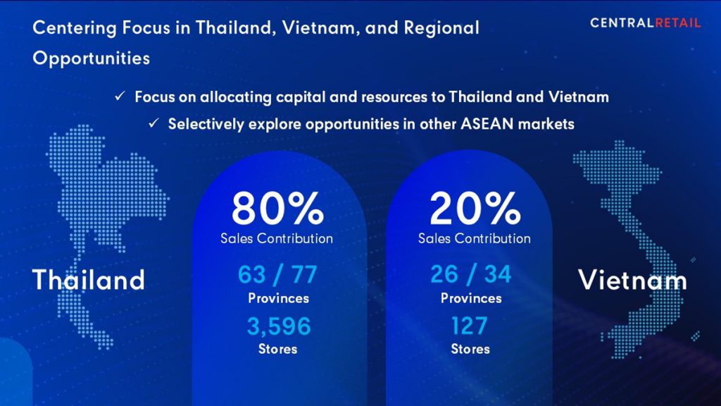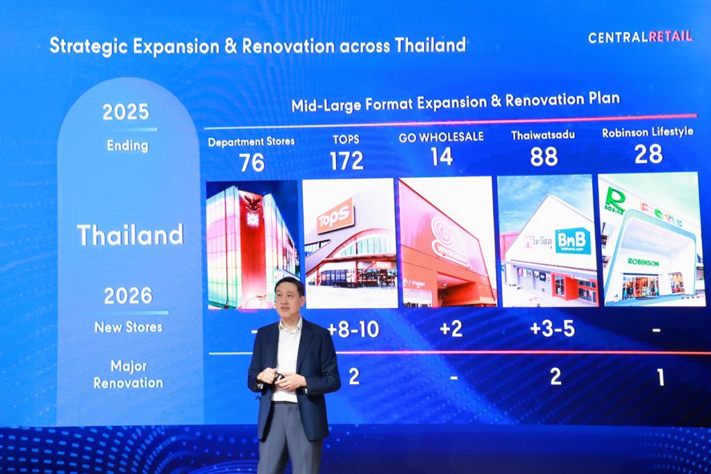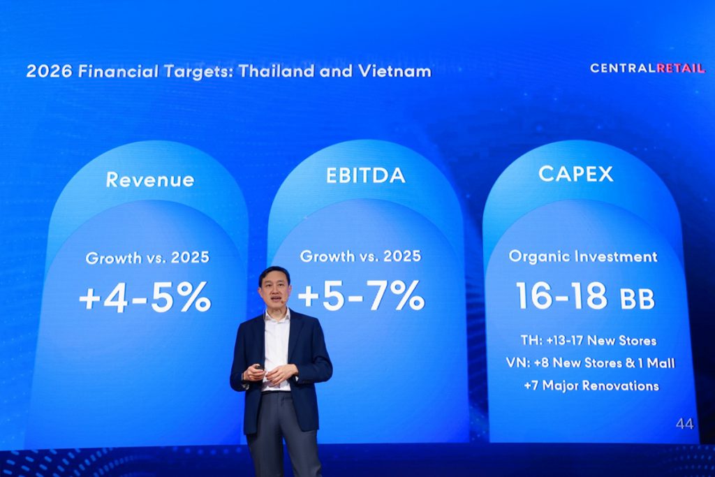 ส่วนประเทศไทย จะเน้นเพิ่มความหลากหลายของแบรนด์สินค้าแฟชั่นชั้นนำจากไทยและเอเชีย พร้อมเร่งเครื่องขยาย KIS & LOOKS Beauty Specialty Stores ปรับรูปแบบสาขาและราคาสินค้าให้เข้าถึงง่ายขึ้น เพื่อเจาะกลุ่มลูกค้า Young & Mainstream อัพเกรดประสิทธิภาพการบริหารงานและขยายขีดความสามารถในการแข่งขัน ด้วยเทคโนโลยีล้ำสมัย (Drive Operational Excellence) โดยมีการยกระดับการดำเนินงานในหลายมิติ อาทิ การนำ AI มาใช้เสริมศักยภาพในการบริหารลูกค้า, การทำการตลาด, การสั่งสินค้าและกำหนดราคา รวมถึงการบริหารจัดการหน้าร้าน ตลอดจนการเพิ่มประสิทธิภาพและความคล่องตัวในการทำงานของพนักงาน เพื่อสร้างองค์กรที่พร้อมรับการเปลี่ยนแปลงในอนาคต นอกจากนี้ยังได้พัฒนา One Data Platform เพื่อเชื่อมโยงข้อมูลลูกค้าจากทั้งออนไลน์และออฟไลน์ให้เป็นหนึ่งเดียว (Single View of Customer Data) ซึ่งจะช่วยให้บริษัทฯ สามารถเข้าใจพฤติกรรมลูกค้าได้ลึกซึ้งยิ่งขึ้น และสามารถนำเสนอ Omnichannel Coupon ที่ตอบโจทย์ลูกค้าในทุกช่องทางได้อย่างไร้รอยต่อ นอกจากนี้ บริษัทฯ ยังมุ่งยกระดับประสิทธิภาพการดำเนินงานด้านระบบ ทั้งการบริหารจัดการสต๊อกและการจัดส่งสินค้าแบบครบวงจร เพื่อสร้างการเติบโตอย่างแข็งแกร่งในปี 2569 เซ็นทรัล รีเทล ประกาศทุ่มงบลงทุน 16,000–18,000 ล้านบาท สำหรับการรีโนเวทและการขยายสาขาทั้งในประเทศไทยและเวียดนาม ซึ่งเป็นตลาดยุทธศาสตร์สำคัญ โดยวางแผนขยายสาขาใหม่ของท็อปส์ 8-10 สาขา, GO Wholesale 2 สาขา และไทวัสดุ 3-5 สาขา ส่วนในประเทศเวียดนาม มีแผนขยายสาขาศูนย์การค้า GO! 2 สาขา, ไฮเปอร์มาร์เก็ต GO! 1 สาขา และซูเปอร์มาร์เก็ต Mini go! 6 สาขา พร้อมทั้งมองหาโอกาสในการขยายธุรกิจในตลาดอาเซียนอื่น ๆ อย่างรอบคอบ โดยตั้งเป้าการเติบโตของรายได้ปี 2569 อยู่ที่ 4-5% และ EBITDA ที่ 5-7% เมื่อเทียบกับปีก่อนหน้า ทั้งนี้ เซ็นทรัล รีเทล ให้ความสำคัญกับการบริหารการเงินอย่างมีวินัยเพื่อสร้างยอดขายและกำไรที่มีคุณภาพ รักษาความแข็งแกร่งทางการเงินเพื่อรองรับโอกาสในการควบรวมและเข้าซื้อกิจการ (M&A) ในอนาคต พร้อมทั้งสร้างผลตอบแทนที่ยั่งยืนแก่ผู้ถือหุ้นอย่างต่อเนื่อง